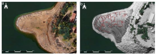 Archeological site documented through remote sensing acquisitions. (a) Aerial overview. (b) Digital Terrain Model. Copyright “Ager Mellariensis”/AEI FEDER HAR 77136-R.