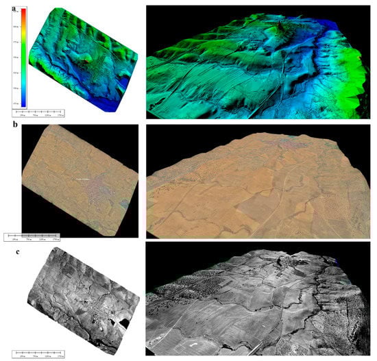 Results of the ortophogrammetric acquisitions of the area surrounding the CCB: (a) DTM; (b) RGB sensor; (c) thermal sensor. Taken from Quantalab-IAS/CSIC and ZNIR for “Ager Mellariensis”/AEI FEDER HAR 77136-R.