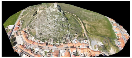 The graphic documentation of archeological heritage in Spain [29,30] and Europe [31,32] has advanced rapidly in recent years, owing to the development of consumer UAVs and user-friendly, high-performance photogrammetric software. This technology was used to conduct three photogrammetric acquisition campaigns in the surroundings of the CCB and at the top of the castle (Figure 3).