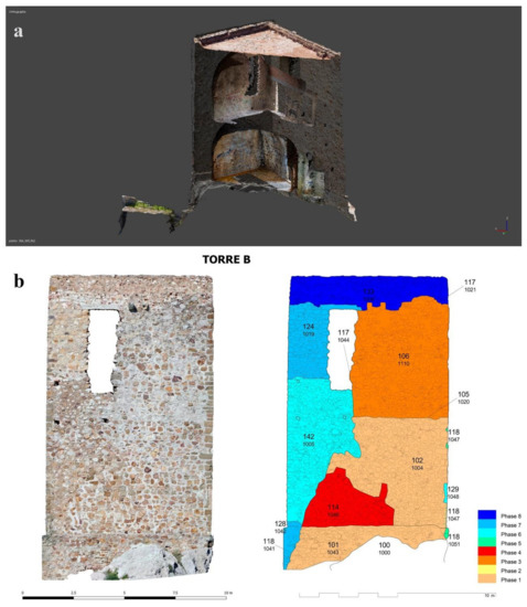 (a) Results of ortophotogrammetric acquisitions of the tower of the medieval Castle of Belmez. (b) Stratigraphic results. Images from Urbe pro Orbe for “Ager Mellariensis”/AEI FEDER HAR 77136-R.