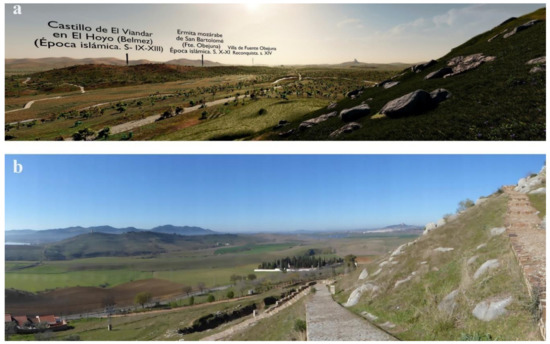This paper presents an investigation carried out in the framework of the Ager Mellariensis research project, conducted in the Cerro de Castillo landscape located in the Alto Guadiato Valley of Cordoba, Spain (Figure 1). The study site covers an area of around 800 hectares and contains megalithic monuments, protohistoric metallurgical settlements, Roman roads, Late Antique monasteries, Andalusí fortresses, medieval castles and villages, and historical routes, as well as many native and foreign flora and fauna species that have developed over time (Figure 2). There is documented evidence of the development of the Alto Guadiato Valley dating to the Chalcolithic period (ca. 2500 BC), when copper began to be mined, extensive agriculture was developed, the number of settlements grew, and several megalithic monuments were constructed [1]. At that time, mining was the main industrial activity in the area, which intensified toward the end of the Iron Age (approximately 1000 BC). However, it was not until Roman times that the Alto Guadiato Valley became an important center of metallurgical activity, with the large-scale exploitation of lead and silver mines [2,3]. Later, in the Andalusí period (8th–12th centuries), several fortresses were erected, the population declined, and agriculture ceased to be a prominent activity. Following the Castilian conquest beginning in the thirteenth century, the lands became property of the nobility and the mining activity that had characterized the area until this time disappeared [4,5].