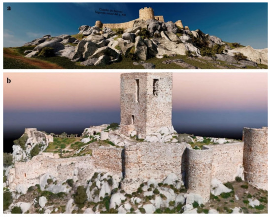 Our objective was to use state-of-the art tools and technologies to digitize heritage resources in 3D format, with a clear research, social, and discursive intention strategy. To this end, photogrammetric flights were conducted and a general inventory was made of the area’s monumental and natural resources, which served as the documentary base for the project. More specifically, the resources were digitized by means of photogrammetric acquisitions using unmanned aerial vehicles (UAVs), airborne thermal and RGB captions, and light detection and ranging (LiDAR) data from the free access IGN files. Subsequently, a monographic study was carried out for the cases that make up this landscape discourse. Regards this second objective, we were particularly interested in the most significant heritage resources located on public land, such as Belmez Castle, which is presented here as an example of the methodology used.