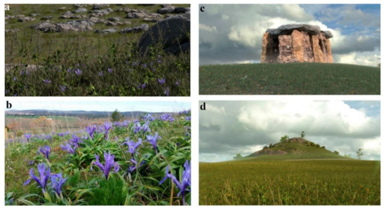 Area surrounding the CCB: (a) Juno planifolia shown in VR; (b) Juno planifolia in autumn-winter in the CCB; (c) megalithic monument (Figure 2a) shown in VR; (d) acropolis of the Roman city of Mellaria shown in VR. Images from Lithodomos VR for “Ager Mellariensis”/AEI FEDER HAR 77136-R.
