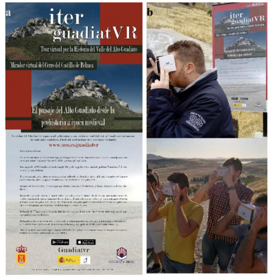 To briefly conclude, this project has allowed us to recover and reconstruct a historical landscape in a novel and successful way through a combination of heritage sciences. At the local, regional, and national levels, we have developed a unique state-of-the-art tool for the protection, conservation, and promotion of heritage. The tool has been presented at prestigious research and transfer fairs in Spain, and also at one of the largest international tourism events in the world, the Fitur fair in Madrid. The GudiatVR app can be downloaded from IOS and Google Play (Figure 15). People can enjoy an immersive experience in the very center of the CCB, where a “mirador virtual” or virtual lookout point was placed. More importantly, this virtual lookout brings the past to life, is accessible to all, is both scientific and attractive, and has served to heighten public interest in these archeological sites. We are currently working on these sites monographically, involving a strong social component.