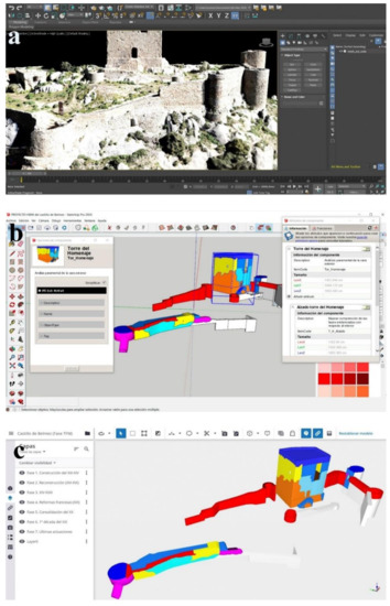 (a) Example of a photogrammetric acquisition. (b) SketchUp software modeling. (c) TrimbleConnect BIM platform. Copyright “Ager Mellariensis”/AEI FEDER HAR 77136-R.