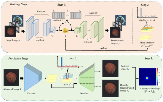 - During anomaly detection, the discrete latent code out of the normal distribution is resampled by PixelSNAIL. After this resampling, the index table is reconstructed to a restored image by the decoder. The greater the distance between the restored image and the image reconstructed directly using VQ-VAE, the more likely the region is anomalous.