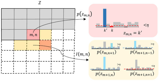 We assume that anomalous region usually has local continuity, and, based on this assumption, we add a local constraint to increase the stability of the resampling. As Figure 2 shows, the probability distribution of the current component (red zone) is conditioned only on previous sequences, lacking the semantic information underneath it. We introduce the likelihood about the bottom half (yellow zone) of the current component’s 8-neighbor to avoid noise. Resampling operation is applied when the likelihood of both current component and at least one component in the bottom half is less than the threshold.