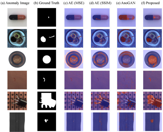 Comparison of qualitative results. (a) test images with anomalies; (b) ground truth of test images; (c–f) segmentation results for MSE-based AE, SSIM-based AE, AnoGAN and proposed method, respectively. Blue areas are anomaly-free, red areas are anomalies.