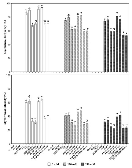Effects of salt stress and biofertilizers on arbuscular mycorrhizal fungal (AMF) root colonization frequency and intensity of date palm vitroplants. Comp: compost; AMF1: native AMF consortium; AMF2: AMF pure strain; PGPR plant growth promoting rhizobacteria. Data presented are means ± standard deviations, n = 3. Bars followed by the same letters within the same salt stress level are not significantly different according to Student–Newman–Keuls test (p < 0.05).