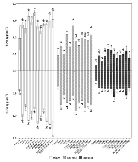 Effects of salt stress and biofertilizers on shoot dry weight (SDW) and root dry weight (RDW) of date palm vitroplants. Comp: compost; AMF1: AMF consortium; AMF2: AMF pure strain; PGPR plant growth promoting rhizobacteria. Data presented are means ± standard deviations, n = 3. Bars followed by the same letters within the same salt stress level are not significantly different according to Student–Newman–Keuls test (p < 0.05).