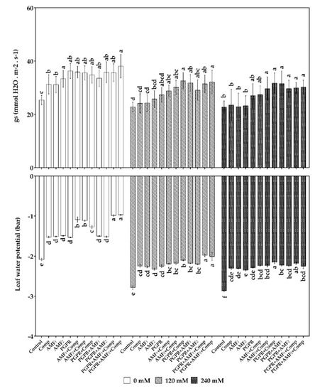 Effects of salt stress and biofertilizers on gas exchange (gs) and leaf water potential of date palm vitroplants. Comp: compost; AMF1: AMF consortium; AMF2: AMF pure strain; PGPR: plant growth promoting rhizobacteria. Data presented are means ± standard deviations, (gs: n = 8; Ψ: n = 3). Bars followed by the same letters within the same salt stress level are not significantly different according to Student–Newman–Keuls test (p < 0.05).