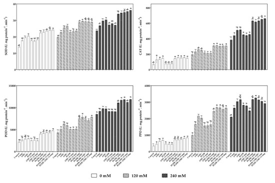 Salt stress significantly increased the SOD, CAT, POD and PPO activities, regardless of whether the plants were treated with biofertilizers or not (p < 0.001; Figure 4). The SOD activity was significantly enhanced under stressed and non-stressed conditions by the application of all the treatments compared to the control plants (p < 0.001, F = 1029.92). The highest improvement was recorded in plants treated by PGPR+AMF2+Comp. According to the CAT activity, all applied treatments enhanced this activity than control plants independently of the salt stress level (p < 0.001, F = 767.85), except in the PGPR, AMF1+Comp and AMF2+Comp treatments, did not affect the CAT activity under 0 mM of salinity level. The high enhancement was recorded in the plants submitted to the high salinity level and treated with the PGPR+AMF1+Comp and PGPR+AMF2+Comp treatments. The POD activity was significantly enhanced by the application of PGPR bacteria AMF and compost, alone or in the different combinations under whatever salinity level (p < 0.001, F = 978.06). Under 240 mM level, the PGPR+AMF1, PGPR+AMF2 and PGPR+AMF2+Comp treatments greatly increased the POD activity by 37%, 39% and 39% respectively over control plants and the other treatments. For PPO activity, the applied treatments generally increased this enzymatic activity over control plants under stressed conditions (120 and 240 mM) (p < 0.001, F = 930.84). A high increment in PPO activity was recorded in plants inoculated with PGPR bacteria and AMF1 (PGPR+AMF1), with enhancements of 170% and 54% for120 and 240 mM of NaCl, respectively compared to the controls. However, under non-stressed conditions, only AMF1, AMF2, PGPR+Comp, PGPR+AMF1, PGPR+AMF2, PGPR+AMF1+Comp and PGPR+AMF2+Comp treatments increased the PPO activity compared to the control plants.