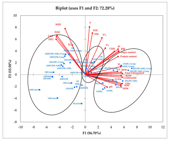 The principal component analysis (PCA), Comp: compost; AMF1: AMF consortium; AMF2: AMF pure strain; PGPR: plant growth promoting rhizobacteria; PH: plant height; LN: leaf number; SFW: shoot fresh weight; SDW: shoot dry weight; RFW: root fresh weight; RDW: root dry weight; Fv/Fm: chlorophyll fluorescence; gs: gas exchange; Ψ: leaf water potential; F%: mycorrhizal frequency; I%: mycorrhizal intensity; Chla: chlorophyll a; Chlb: chlorophyll b; PPO: polyphenoloxidase; POD: peroxidase; CAT: catalase; SOD: superoxidedismutase; EC: electrical conductivity; TOC: total organic carbon; OM: organic matter; P: soil Polsen.