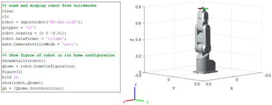 Figure 2 visualizes the imported structure of RV-2AJ arm in the MATLAB environment and the script code used for it. The visualization of the robot arm uses the RV-2AJ.URDF definition file and the “show (robot, Qhome)” command performs the visualization, as can be followed in the MATLAB code.