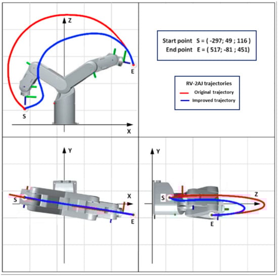 The suggested trajectory—named “improved path” given in blue in three views (front, top, and left side views) with the robot arm in Figure 3—is based on the newly elaborated special method that imitates the natural motion of a whip. The improved path aims to decrease the cycle time for RV-2AJ arm’s movement from the starting point S to the final point E. This method is based on principle of the whip-lashing motion that determines the torques applied in closing and opening of joints of the arm, which will be discussed in the further sections.