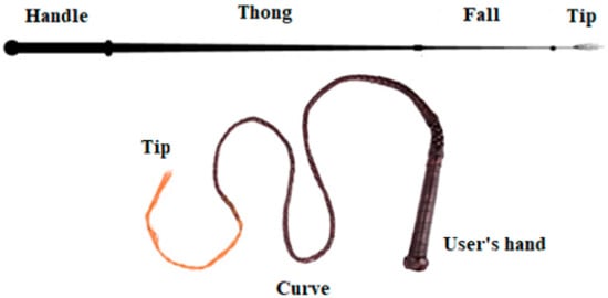 For centuries whips have been considered instruments used to direct animals or torture slaves. Nowadays, this instrument has become an artform for some nations. In the last few years, researchers have been interested in the phenomenon executed by whips, which is characterized by the crack sound and the velocity that can reach supersonic speed [44,45]. Figure 4 presents the basic elements of a simple whip.