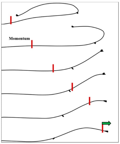 Based on the brief analysis on the motion of the whip and considering the structural similarity to the manipulator arm, the suggestion of a whip-analogous motion and the resulted in trajectory of the gripper seems to be rational. In this article, we applied the same principle to the RV-2AJ arm, where the robot acted as a whip and the gripper executed the trajectory between two points faster than it otherwise would. The whip-lashing motion of the robot arm can be followed through the sub-figures of Figure 7. When the second joint rotation stopped, the momentum WAS transferred to the third and fourth joints. As the moving mass became smaller, the rotational velocity increased at the last links of the robot arm.