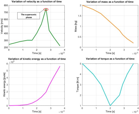 The variation of velocity, mass, kinetic energy, and torque as a function of time.