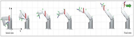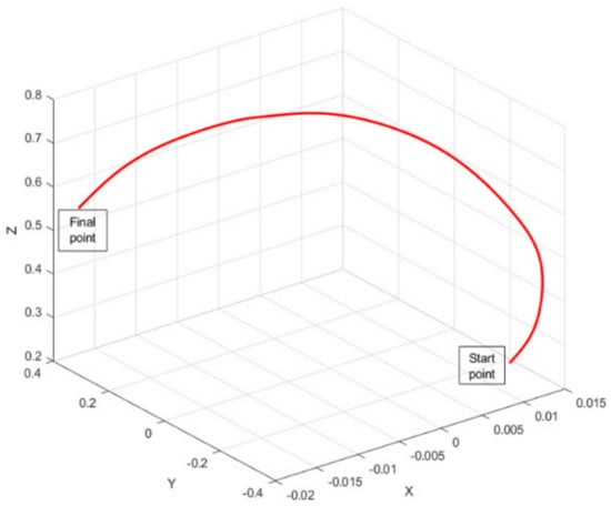 The idea of trajectory improvement is taken from the motion of a whip. When applying a huge force at the handle, it will propagate along the whip’s length, with a wave running alongside the whip transferring the energy from the handle to the tip. In order to realize this idea and check its real effect on the cycle time of robot arm motion, SolidWorks [41] and MATLAB [42] software applications were used in the dynamic motion simulations. For comparison, an “original” path with simple angle interpolation at the joints was also simulated. The two will be compared.
