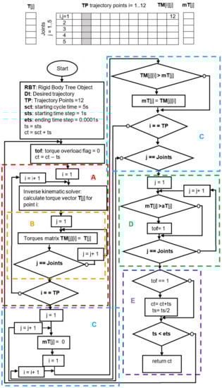 The T torque vector is determined by the “inverse Dynamics MATLAB Robotics System Toolbox function” of the MATLAB Robotic Toolbox. Then, the maximum of every j-th row of TM torque matrix is determined to the j-th cell of the mT[j] maximum torque vector. Then the mT[j] ≤ aT[j] condition setting the tof torque overload flag selects between cycle time decreasing or time step refinement and back stepping.
