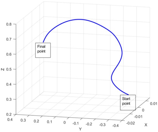 The two trajectories are defined by positioning the same starting and ending points and 10 desired inner points that differ for each path using the spline function of MATLAB script to define the continuous path between the points. Figure 9, Figure 10, Figure 11 and Figure 12 visualize the code script results for both trajectories (the original and the improved). The static Figure 10 and Figure 12 cannot make the motion of the robot arms felt.