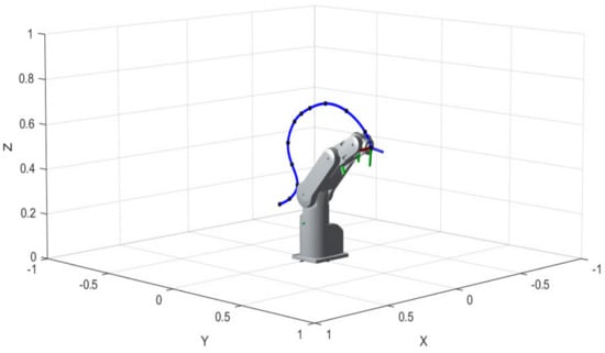 Over the years, researchers studied this field deeply by proposing many methods and solutions to solve trajectory problems for industrial robots [19,20,21,22]. The definition of the optimality concept is divided in many directions. Some scientists focus on a time-optimal trajectory to increase productivity [23,24], while others work on the smoothness of trajectories [25,26], taking into account reducing cycle time by implementing fast trajectories combined with optimal jerk values in order to reduce the excitation of the resonant frequencies and limit the vibrations of the mechanical system [27,28,29]. From the literature, a basic approach is known for generating a trajectory using splines [30,31], where the virtual points are required to ensure the continuity of the trajectory from the starting point to the endpoint. The development of this approach motivated the authors of this study to apply an improved technique in the aspect of motion optimality using B-spline interpolation, based on the calculation of inverse of Jacobian matrix.