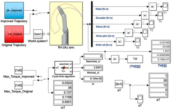 Figure 14 and Figure 15 present the block system needed to determine the finishing cycle time ct and torque vectors T calculated during the ct minimizing process, where the blocks “Improved Trajectory” and “Original Trajectory” contain spline function for each joint specified by angles vector that should RV-2AJ arm execute according to each position. “RV-2AJ arm block” contains the mechanical properties of the robot arm.