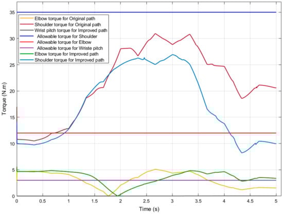Using Scope Box, we visualized the torque diagram of each working joint (second–third–fourth, j = 2, 3, 4) for the original and improved paths (Figure 16).
