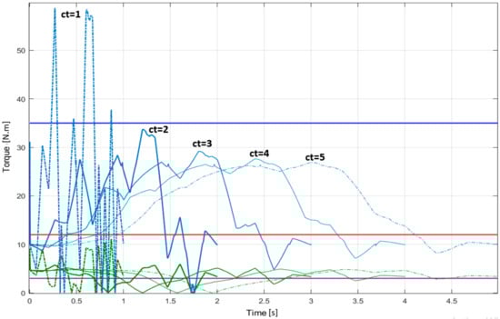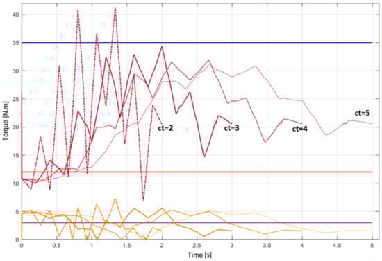 Figure 17 presents the variation of joints torques according to the original path for different cycle times ct = 5, 4, 3, 2 [s] to see the behavior of torque curves and compare their peak values in each iteration, in order to observe when the torque peak of an iteration exceeds the allowable torque value aT.