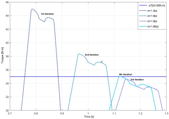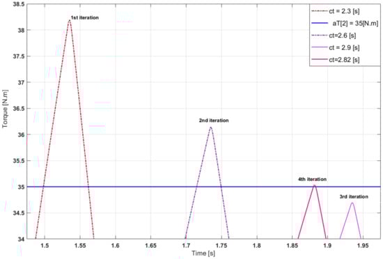 As presented in Figure 18, the searched cycle time sct = 2 [s] obtained for the original path minimized the possible range to find the optimal maximum torque with optimal new cycle time. As a result, the optimal curve for shoulder was the red curve with ct = 2.82 [s]; this curve was obtained after the necessary iterations, starting from the first one, then minimizing the torque till obtaining the optimal curve, the “fourth iteration” m and because we had a condition to stop iteration when the time step ts was smaller than the ending time step ets; therefore, the algorithm completed the execution and found a better solution with ct = 2.82 [s], as presented in the first section.