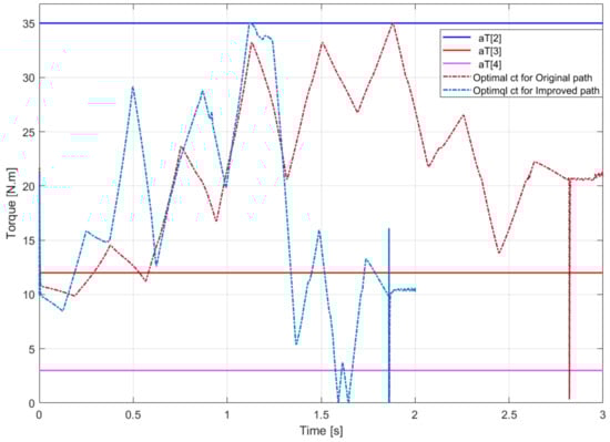 Based on the demonstration of diagrams and the comparison between the multi graphs of each path for the second joint, it was clear that the original path exceeded the allowable torque aT optimally with ct = 2.82 [s], unlike the improved path, which exceeded optimally aT with ct = 1.86 [s], as presented in Figure 21. Consequently, we proved that the improved path consumed 33% less time than the original path, which verified the concept of optimization.