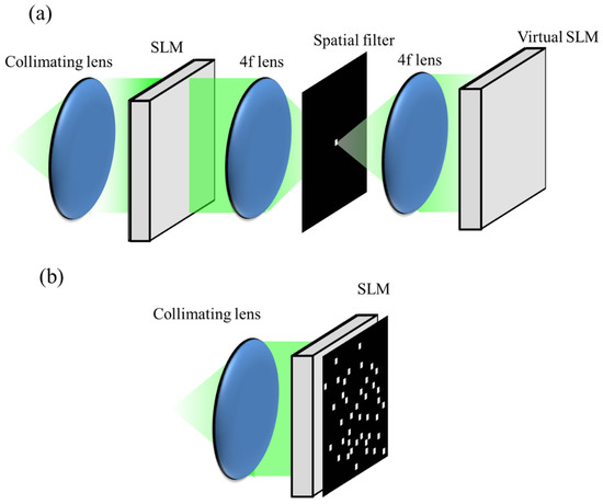 - Zang, H.; Xie, J.; Wang, Y. Elimination of a zero-order beam induced by a pixelated spatial light modulator for holographic projection. Appl. Opt. 2009, 48, 5834–5841. [Google Scholar] [CrossRef] [PubMed]