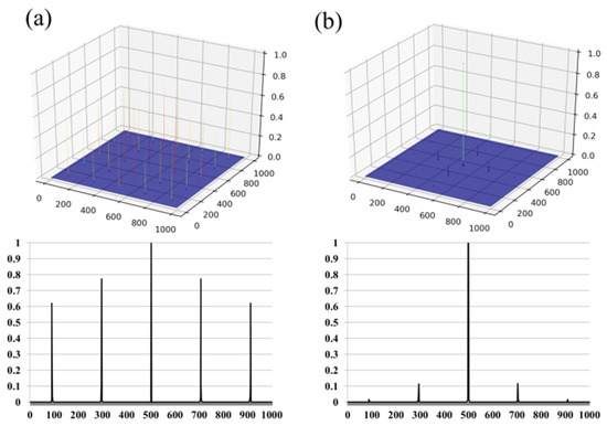 All the variables in this study are shown in Table 1. In the numerical simulation, the diffraction order’s intensity of a single point located 50 cm from the hologram plane was calculated, as shown in Figure 3.