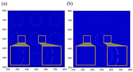 In order to verify the feasibility of the proposed method practically, a ring point cloud model consisting of 66 points was reconstructed with an equivalent method via a single-point simulation. The inner ring and outer rings were positioned at 50 and 51 cm from the hologram plane, respectively. The observation was then made at the outer ring position. As a result, the high-order images of the non-periodic pixels vanished, as shown in Figure 4.