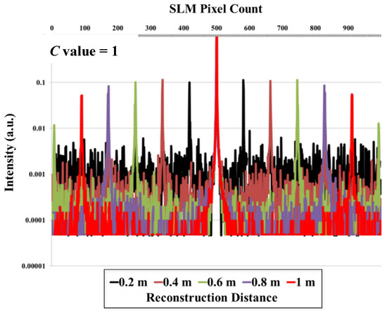 In this paper, an LCG (linear congruential generator), commonly used as the random number function in C++, MATLAB, and Python, was used to produce the random numbers. However, unfortunately, the results of the LCG exhibited periodicity and tended to be biased to one side [8]. Therefore, it cannot be said that the results of this study are optimal. If there is a more exquisite random number generator, the quality of the proposed idea will be improved. In addition, when the reconstructed hologram approaches the hologram plane, the background noise increases slightly. Usually, the reconstructed hologram is duplicated by high-order diffraction due to the periodicity of the pixels. By contrast, the proposed hologram is calculated based on non-periodic pixels; hence, it has no high-order diffraction and no duplicated holograms, but the hologram data are regarded as noise in the high-order diffraction region. Therefore, as shown in Figure 5, the background intensity of the single-point hologram decreases according to an increase in the hologram reconstruction distance.