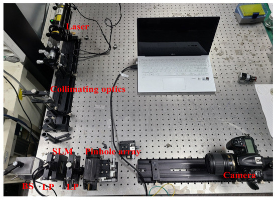 The experimental conditions were identical to those in the numerical simulation, apart from the C value. The reconstructed hologram was captured with a digital camera. Figure 7 shows the optical system used in the experiment. In addition, the C value in the practical context was determined as the effective pixel aperture divided by the pixel pitch. The effective pixel aperture was determined by the fill factor of the spatial light modulator. Our spatial light modulator had a 58% fill factor with a 36 μm pixel pitch; hence, the effective pixel aperture was only 20.88 μm. Therefore, unfortunately, the C value could not exceed 0.58 in this experiment. Although the random pinhole array filter was created with a C value of 0.6, which was suitable for our SLM, Figure 8a,b demonstrate feasible performance in that the high-order images were eliminated.