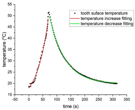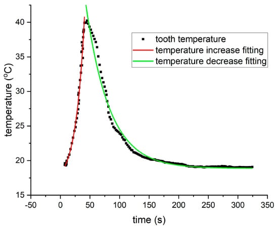 Changes in the temperature of the teeth during polishing and while cooling down were adapted to the exponential and two-exponential functions. Identification of model parameters was carried out using the Levenberg–Marquardt method for the parameter space, the scope of which was determined arbitrarily.