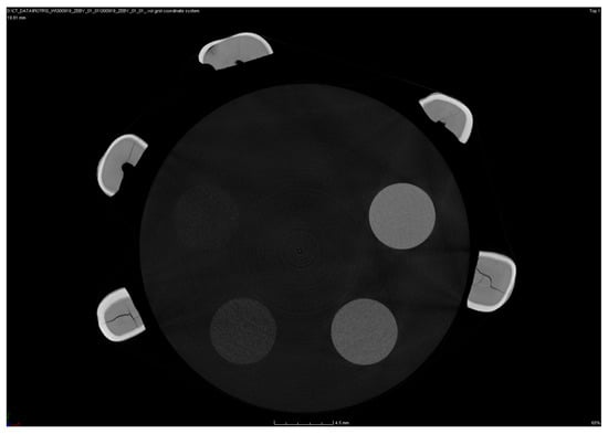 In order to determine the density of individual tooth elements, their microtomographic scans were analyzed. An example of a microtomographic scan is shown in Figure 3, which shows five premolars and a density template.