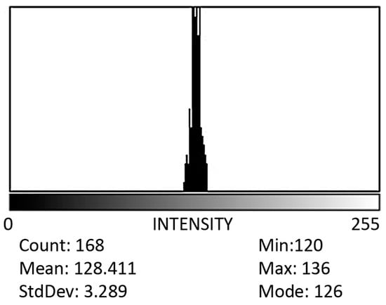 Using the interdependence between the level of grey of the microtomographic image and the density of the object, which is proportional to the greyness, areas corresponding to the defined density were determined within the template and then the average brightness of this area was determined in ImageJ. An example of a histogram is shown in Figure 4.