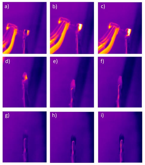 Exemplary thermograms of incisors subjected to polishing with water cooling. (a) 10 s of polishing; (b) 20 s of polishing; (c) 60 s of polishing; (d) immediately after finishing; (e) +5 s after finishing; (f) +10 s after finishing; (g) +20 s after finishing; (h) +50 s after finishing; (i) +70 s after finishing.