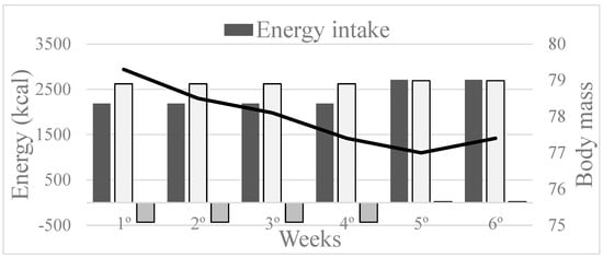 There is a certain relationship between the weight lost and performance via the improvement of the power-to-weight ratio, which is particularly desired in weight-class sports such as powerlifting. A decrease in BM could lead to lean body mass (LBM) or FFM loss. However, it has also been suggested that BM reductions throughout the season should be achieved in a slow fashion when the main goal is to preserve skeletal muscle mass [9]. It has been suggested that losing 0.7% of BM per week might be better than 1–1.4% of BM for athletes who would like to preserve or gain LBM and strength [16]. Nonetheless, it was also recently reported that a gradual weight loss is associated with greater loss in FM and body fat percentage, but it was not associated with changes in FFM in overweight and obese adults and older individuals [17]. Our results show that the athlete’s mean weekly weight loss during the first four weeks of the intervention (0.47 kg/week) was consistent with results reported by some authors [9], while others recommended minor weekly weight losses in physique athletes (<0.5% of BM per week) [18]. It should be mentioned that these nutritional recommendations were obtained for bodybuilders, whose body fat percentage tends to be lower during the season. Moreover, the magnitude of the energy deficit [19], the rate of BM loss per week [20], nutritional considerations such as timing, protein intake, etc., and the body composition assessment methods employed could help explain FFM variations along the weight loss phase.