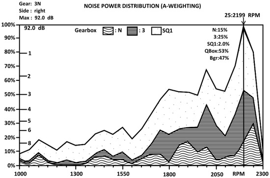 However, the dominant share of noise in gearboxes is almost always due to the excitation of vibrations in the gear mesh. Figure 1 shows an example of the overall evaluation of the noise of an automobile transmission, where the share of the separated gear mesh noise (labeled as N and 3) is in the region of a maximum of 40% of the transmission noise, which contributes 53% to the total noise. The remaining 47% is background noise (labeled Bgr), which can mainly include bearing noise.