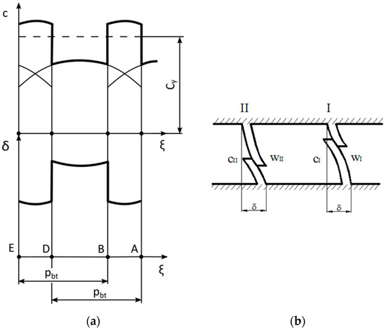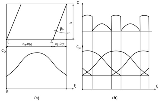 It is relatively easy to determine the stiffness cp along the length of the contact line of one pair of teeth of helical gearing. This varies depending on the coordinate of the path contact ξ, as shown in Figure 3a, i.e., for one pair of teeth in contact. The teeth enter the meshing at point E. To a point at a distance equal to εβ.pbt from point E, the contact length increases. Then, up to point A, the contact length is constant. Then the contact length is shortened. In the section of constant contact length, the course of meshing stiffness of helical gearing is similar to that of the meshing stiffness of the spur gear. In sections with a change in contact length, the stiffness of helical gearing changes faster. The result here is, even if there are more pairs of teeth in contact (with meshing stiffness of helical gearing for one pair of teeth—cp), there is a periodically recurring step change in the meshing stiffness of helical gearing—c (Figure 3b).