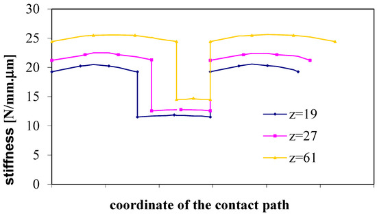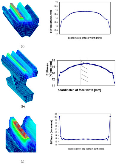 The stiffness of teeth was not constant, even over the face width of the toothing (Figure 12). If the face width was the same for both the driving and the driven gear wheel, the stiffness of the teeth was smaller at these edges due to the free end of the tooth lacking a supporting effect (Figure 12a). If the face width was not the same for the driving and driven gears, on a wheel with a larger face width where the line of contact does not end at the edge of the face width (Figure 12c), there will be a fairly sharp increase in teeth stiffness at the edges of the contact due to the support effect. This is due to the low deformation of the tooth at the edges of the face width. The location of the web will affect the course of the stiffness of the tooth along the face width. At the location of the web, the stiffness of the tooth increased slightly locally (Figure 12b).