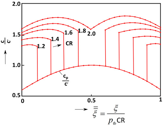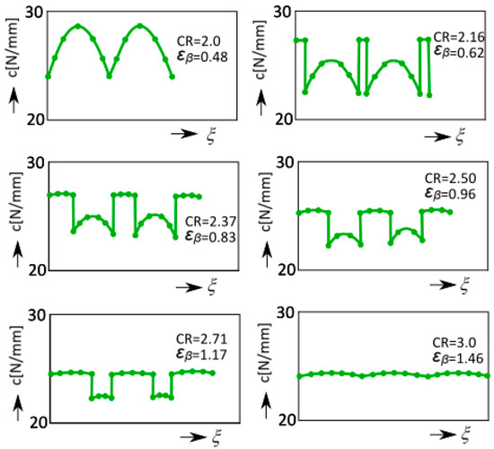 The meshing stiffness also depends on the contact ratio of the gearing. The effect of this contact ratio CR on the meshing stiffness of spur gearing is shown in Figure 7, where c is the meshing stiffness of the spur gearing, c’ is the maximum stiffness at the contact of one pair of teeth, ξ is the coordinate of the contact path, CR is contact ratio, and ptb is pitch of the base circle. It can be said that as the contact ratio of spur gearing increases, so does the meshing stiffness of this gearing.