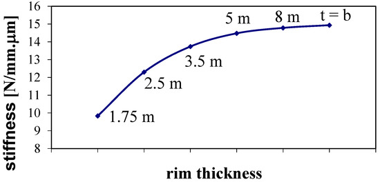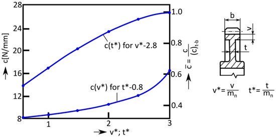 The influence of rim thickness v and web thickness t on the meshing stiffness (Figure 10) on spur gearing was investigated on spur gear set with number of teeth z1 = z2 = 32, where the modulus in the normal plane was mn = 5 mm, mesh angle was αn = 20°, and face width was b = 15 mm. As the thickness of the rim increased, so too did the meshing stiffness; furthermore, as the thickness of the web increased, the meshing stiffness also increased. Up to the size of the rim thickness equal to v = 3.5mn the meshing stiffness increased more noticeably, then it had a slower increase (Figure 11).