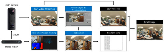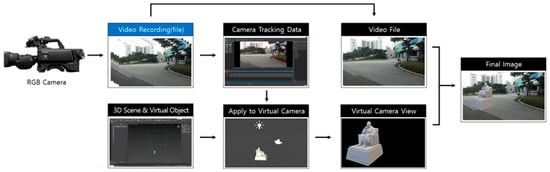 In general, 360° video is viewed by wearing a head-mounted display (HMD). Many people experience physical discomfort and symptoms such as headaches, disorientation, and nausea when they wear an HMD [1]. This is VR motion sickness. One of the reasons this occurs is due to the user receiving insufficient updates regarding sensory information from the vestibular system [2]. When 360° video content includes fast camera movement, visual information keeps changing but the user’s actual body position is fixed, which causes motion sickness. For this reason, most 360° video clips are taken from a fixed position. Synthesizing a virtual object into a fixed 360° video clip does not require a long processing time. The clip can be inserted at the desired position from the center of the camera. There have recently been various types of VR content used in film, education, and tourism which include stable movements filmed using special drones or cars. In the case of a 360° video clip including camera motion, a process of synchronizing the motion of the Red-Green-Blue (RGB) camera (actual camera) and a virtual camera is applied for the 3D composition. This process works by extracting internal (focal length) and external (position and rotation) parameters from the RGB camera used to capture a real scene [3,4]. From these parameters, we can retrieve the motion of the RGB camera, and this is called camera tracking [5]. The traditional 3D composition method estimates the trajectory of the camera by analyzing the feature points of each frame from the captured images. This method has a disadvantage in that the video resolution and camera-tracking processing times are proportional, and the composition results can only be confirmed after several processes (e.g., recording and camera tracking).