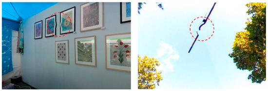 In general, the 3D composition method tends to depend on the camera-tracking result. Therefore, if the camera-tracking process fails the video must be reshot, which wastes time and money. In previous studies, we reported that various factors may lead to the failure of camera tracking, including an occlusion by a person or object, and motion blur caused by fast camera movement [11]. However, this is more likely to occur in a 2D video shot with relatively numerous camera movements. For a 360° video clip there is a low possibility of camera tracking failures from such factors because stable camera movements are applied to prevent user motion sickness when wearing an HMD. Nevertheless, there is a factor that has not yet been mentioned, caused by a difference in the production processes between 2D and 360° video. In 360° video more than two cameras are used for capturing each different camera view, and after recording in real-time a 360° panoramic view is created through a matching process called “stitching”, which overlaps parts from each video clip [12]. During this stitching process errors can occur as a result of inaccurate matching due to lens distortion. These errors interfere with the tracking of the feature points in a 360° video clip containing camera movement. As a result, accurate 3D composition is hindered, and human resources are wasted. Figure 2 shows such stitching errors.