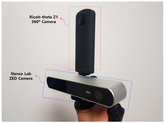 In our proposed system, we use a 360° camera “Z1”, developed by Ricoh-theta [27]. Z1 can record in 4K (3840 × 2160). It can also use real-time video streaming with stitching to 3D programs such as Unity and Unreal. This 360° camera system and the ZED mounted on a rig are connected to a PC through a USB 3.0 port. In addition, the ZED is configured such that it faces the same direction as the front of the 360° camera. The 360° camera is used to record the images of the real scene, and at the same time, the ZED extracts the external parameter by generating a depth map in real-time. The ZED generates the initial value of position data (0,0,0) when the program starts, so the difference in the physical distance between the ZED and Z1 is not considered. Figure 4 shows the rig-mounted 360° camera and the ZED.