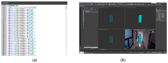 The trajectory data stabilized through the Kalman filter can be saved in various formats for application to 3D programs during post-production. In this paper, we saved the data using the 3ds Max file scripting language (.ms) to create a virtual camera in 3ds Max. Figure 5a shows the 3ds Max script file and Figure 5b shows the 3D composition in the 3ds Max program.